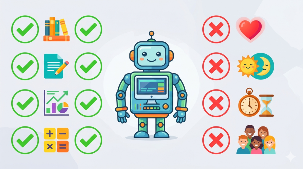 AIが苦手なことを知れば、使い方が3倍うまくなります。最新情報・感情・物理作業——限界を正しく理解して、AIを道具として賢く使いこなしましょう。 -